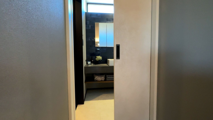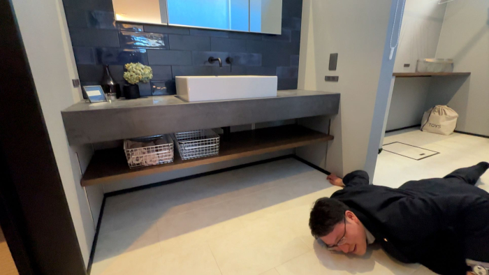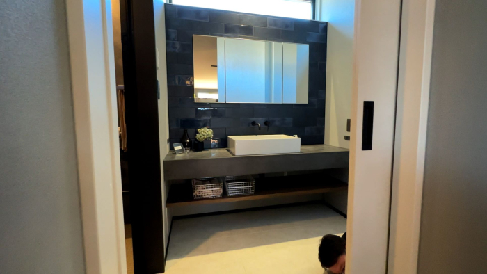 洗面台のシーンですが、西村が「ビフォア&アフター風(ドアが無人で開いてスーッとカメラが入っていくやつ)」をやりたいというのでドア開けをお願いしたところ…