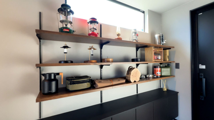 本モデルハウスに住まわれる方のイメージとして「アウトドアを楽しんでいるご家族」を設定しました。そして、より魅力を高めるために玄関雑貨展示品には札幌市南区にあるキャンプ・アウトドア用品店の「sabi(サビ)さん」にご協力いただき、とても素敵な土間空間が完成しています。