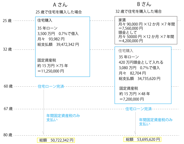 また、家賃として支払うお金の節約になる点も見逃せません。例えば25歳で住宅ローンを組んで返済し始めた場合と、32歳まで家賃を払って住宅ローンを組んだ場合を比較してみましょう。