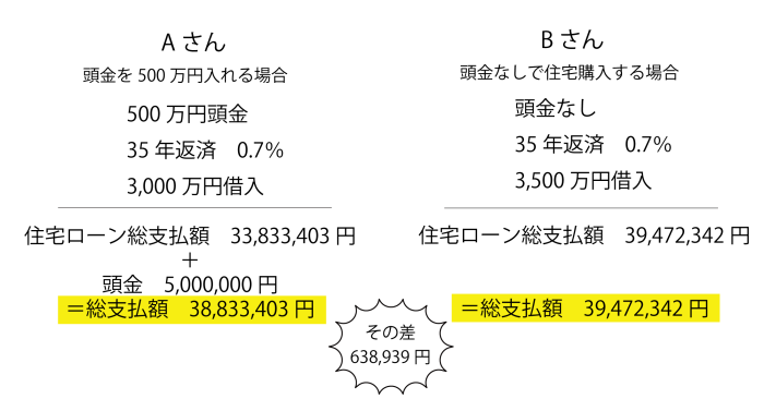 近年の傾向として、極力頭金を少なくして、住宅を購入する方も増えています。低金利が長く続いているため、頭金を入れるメリットが少なくなっているからです。バブル期は金利が高く、物件価格の2~3割の頭金を準備したうえで住宅を購入する人が多くいました。当時の金利は都市銀行の変動金利で8.5%を記録しており、頭金を多く入れたほうが総支払額を少なくすることができたのです。しかし、バブル崩壊後は低金利になり、2~4%で安定しています。では頭金を500万円入れた場合と入れない場合(頭金0円)で実際に比較してみましょう。