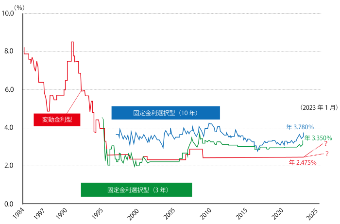 前述の頭金の部分で金利について触れましたが、住宅ローンの金利はここ40年ほどで大きく変化しています。現在は超低金利時代と言われ、日銀ではゼロ金利政策がとられたりと30年前に比べるとかなり住宅購入には有利な状況が続いています。