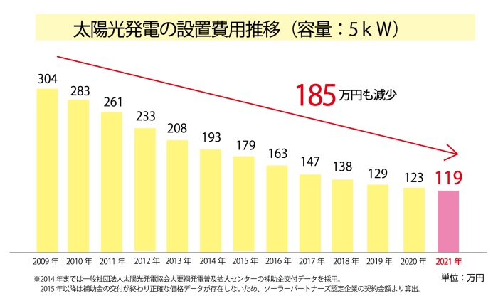太陽光発電のシステム価格は、ここ13年間で大きく下がっています。2009年から見ると、設置方法が多様化したり架台が進化していることもあり、より設置しやすい環境が整ってきていると言えるでしょう。