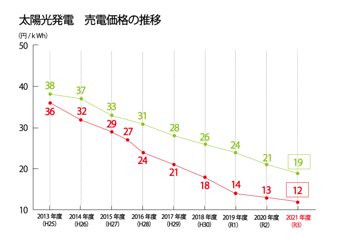 毎年売電価格は下がり続けていて、約10年前から見ると半分になっています。2023年は16円/kwで今後も売電価格は下がっていく見込みです。これに反比例するように日々の光熱費は上昇しています。
