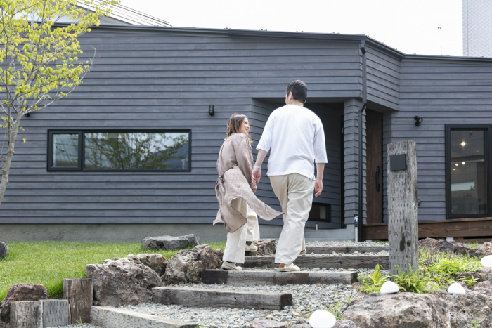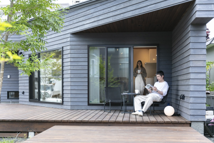 今回のモデルハウスはpopke(ポッケ)という道産材にこだわったシリーズで作られています。まず外壁は道南杉をルビオモノコートという自然塗料を採用しています。塗料はグレーを採用していますが、これは木の経年変化になじんでいくように、グレーを採用しました。また、内装材にもこだわりがあります。床はニッシンイクスさんのイクモリフロア。これも道産広葉樹のナラ材で、やさしい色合いと足触りが特徴です。こちらは使用した分の本数の木の苗木を植林する取り組みがされている商品です。