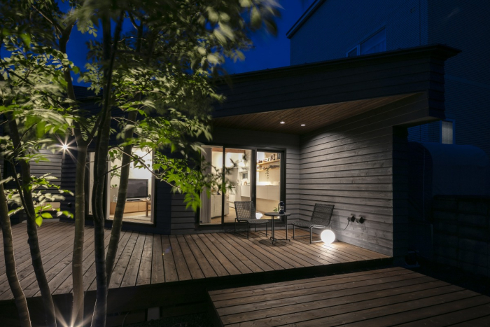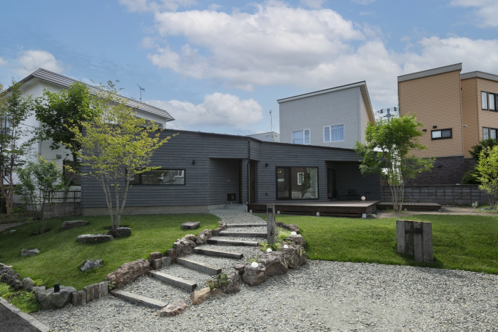 竹内建設の平屋モデルハウスが建つのは、豊平区月寒東3条15丁目の住宅街の中。地役権という建築の制限がかかっているので、土地は100坪ありますが3分の1ほどしか住宅を建てることが出来ません。そのため、1LDKを作るのがやっとという面積しか使えないので、単世帯やご夫婦を想定して、「のんびりと街中だけど庭を建物の中に取り込んだコンパクトな家」ということを意識して設計プランは建てられました。実はこちらのモデルハウスは建築制限のため三角形の一番広い面が庭側に向いています。LDKからも寝室からも庭を楽しみ、庭と一体に暮らすことができるプランとなっています。