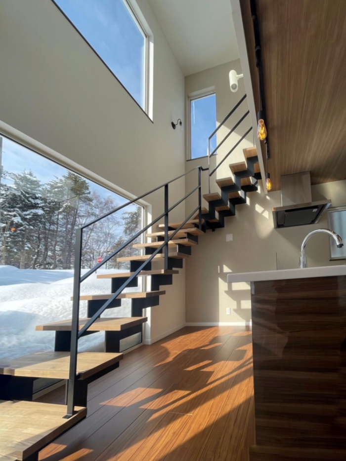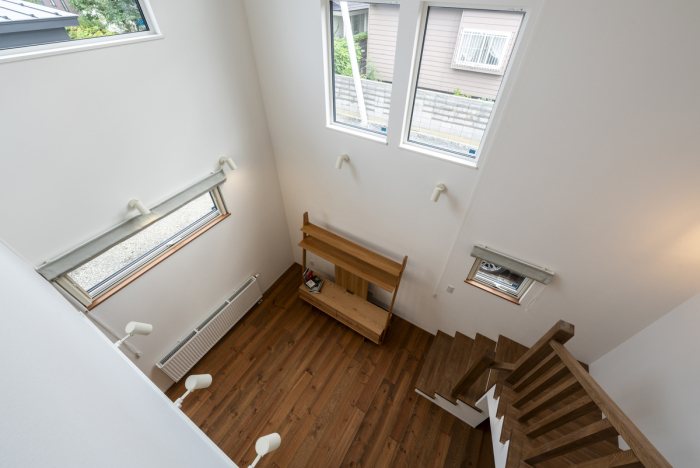 キッチンの横にある階段に合わせて作られた吹き抜けです。上下に大きな窓が設けられており、階段を上り下りしながら上と下で異なる風景が楽しめる作りになっています。