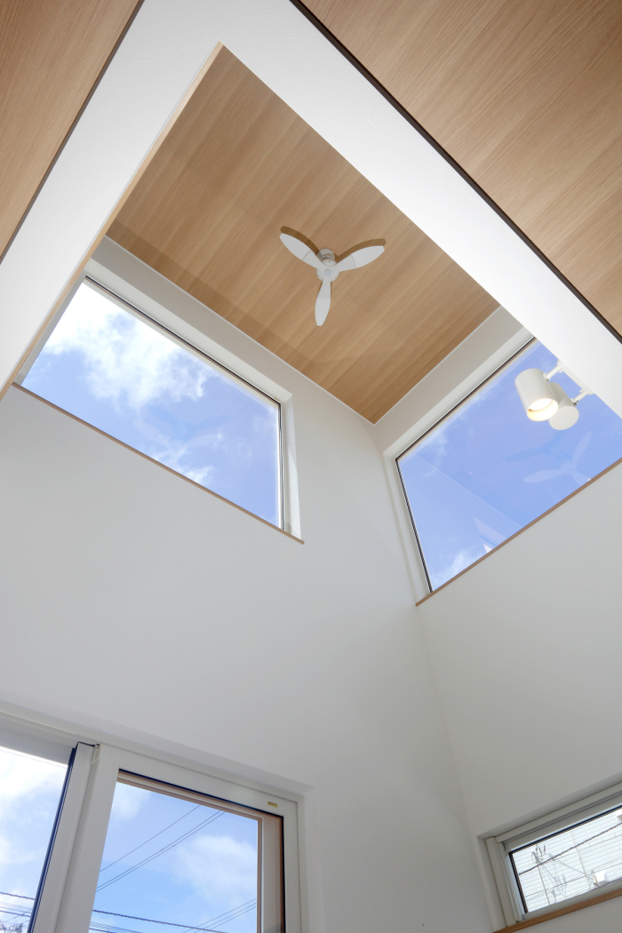 リビングの一部を吹き抜けにしており、下から見上げると大きな窓から見える青空がまるでアートのようなインテリアに見える素敵な空間になっています。