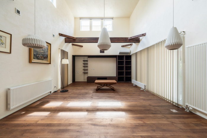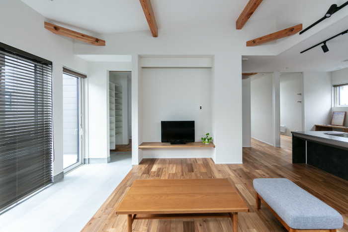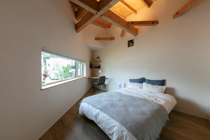 白で統一したさわやかな内装に、勾配のある高い天井には木目が美しい梁がアクセントになっています。窓も高い部分に設置されているので、採光はありながら外からの目線も気になりません。