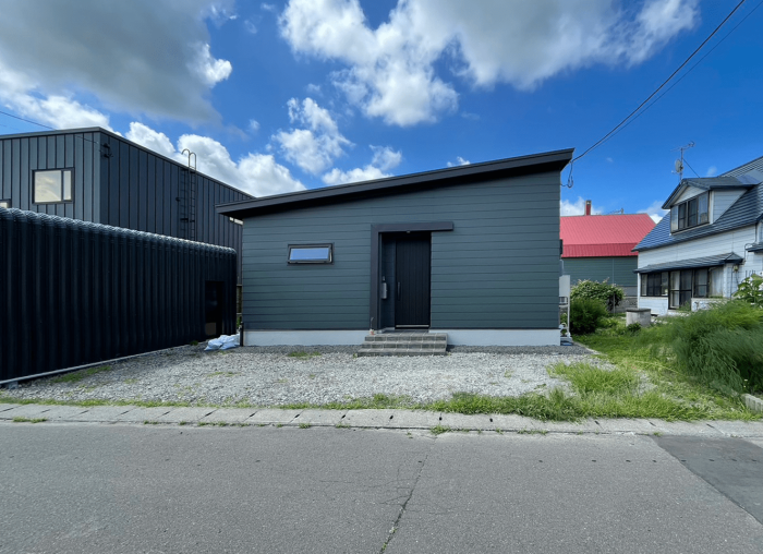 片流れ屋根とホタテ漆喰の塗り壁が特徴のスタイリッシュなデザインの平屋です。『素材と省エネにこだわった大人の平屋』をテーマに建てられました。道に面した壁には小さな窓しかなく、プライバシーをしっかり守ってくれています。
