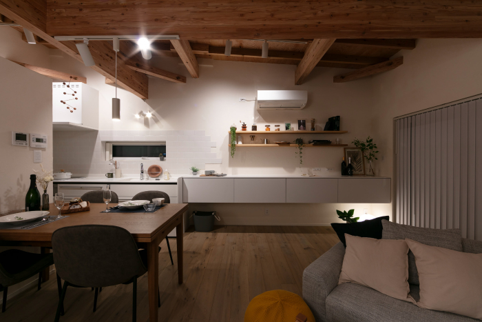 リビングダイニングには、ツヤのある北海道カラマツをそのまま生かした梁が温かみを与えてくれます。梁に取り付けられた照明もさまざまな光でリラックスできる空間を演出しています。