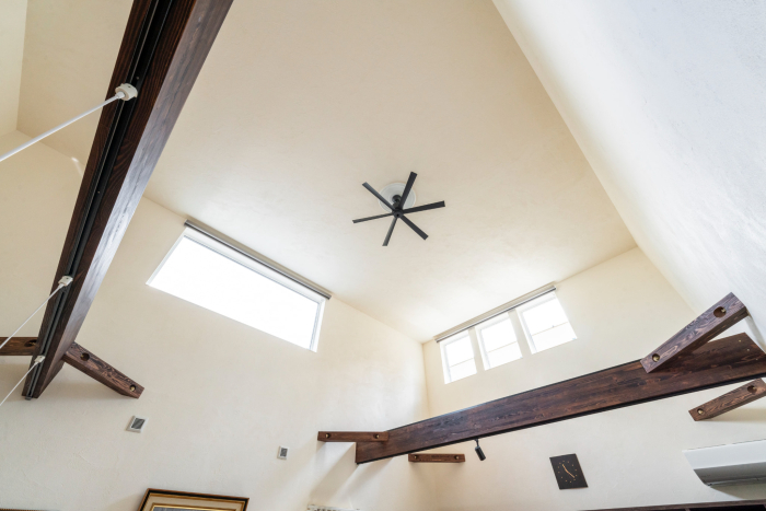 高い天井は広々とした空間を感じさせ、二階建てと同じくらいの高さにある窓からはやさしい採光が届いています。天井に設置されたシーリングファンにより、一年を通して快適な温度になるよう空調の効果を高めてくれます。