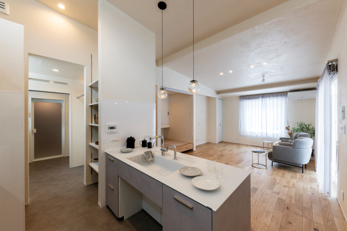 キッチンからリビングまで段差がなく、家事がしやすい動線ができあがっています。扉や仕切りがなく開放的ですね。正面にはなかった大きな窓からの採光もあり、明るい室内となっています。