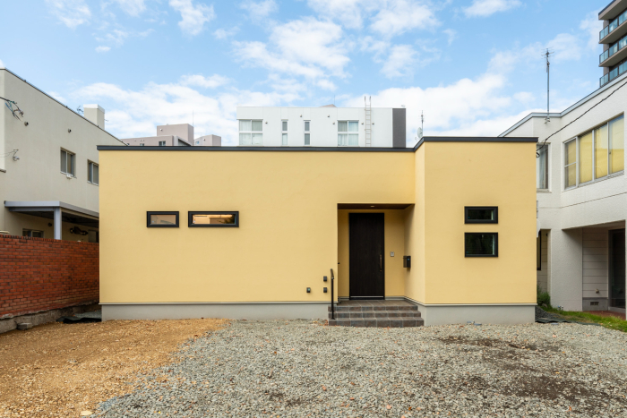 やさしいイエローカラーの外観でかわいらしい印象の平屋です。正面に大きな窓はなく、防犯対策やプライバシー確保もばっちりですね。