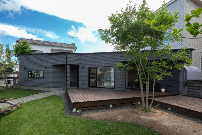 経年の変化も楽しめる天然木を使用した落ち着いたグレーの外壁に、広々としたウッドデッキが開放的な平屋の実例です。単なる四角形ではない複雑な形状も平屋ならではですね。