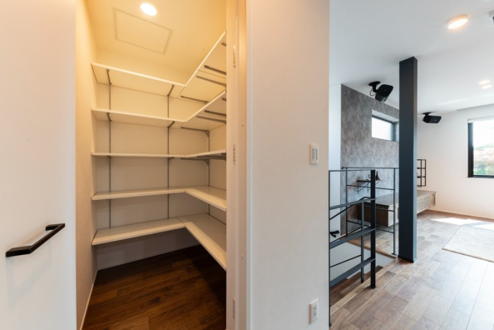 階段を上がったリビング横には、大容量の収納スペースを確保。リビングをスッキリさせられる工夫です。