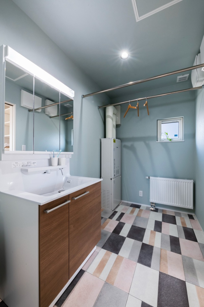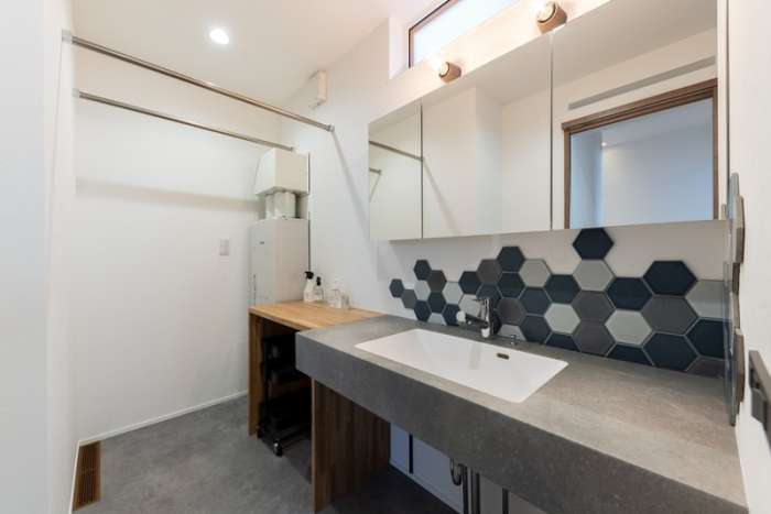 1階に設置された洗面所・脱衣所には広い洗面台とパウダーコーナーを設置。大きな鏡はまるでホテルのような、おしゃれでモダンな印象です。
