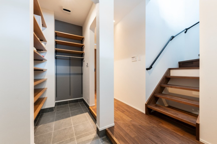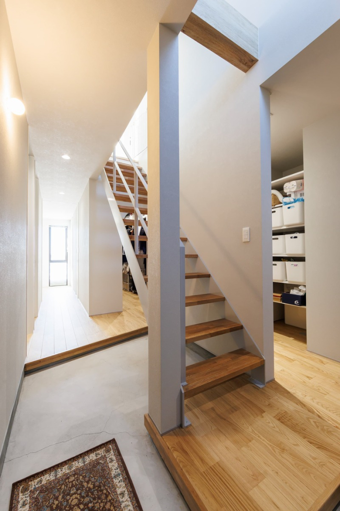 玄関に入るとすぐに階段と収納スペースがあり、食品や日用品の運搬も負担が軽減されるように考慮されています。