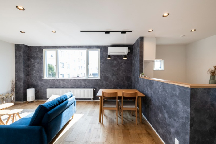 2階リビングはキッチンとダイニングが配置されたLDK。アクセントクロスが家具を引き立て、おしゃれでスッキリとした印象です。