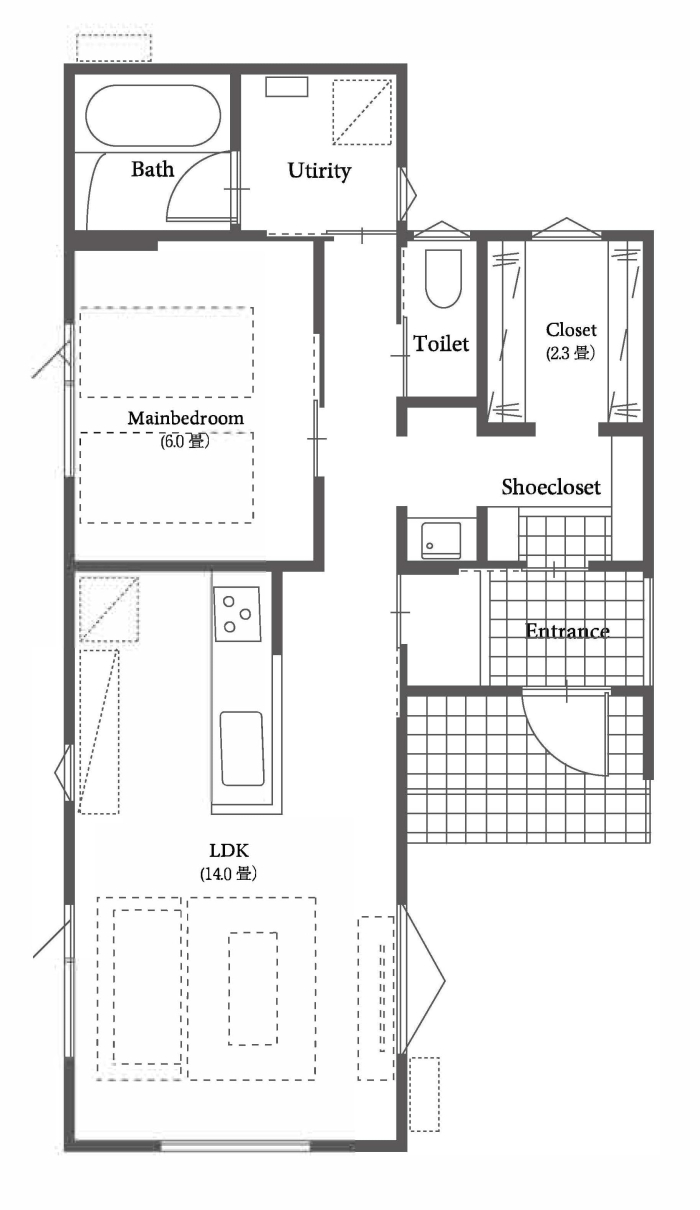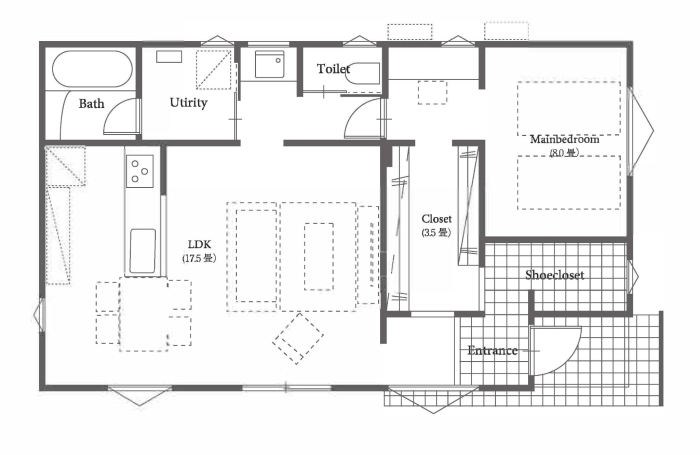 17.5帖の広々としたリビングが魅力の、1LDK平屋。開放感あふれる空間で、日々の疲れも癒します。ベッドルームには、3.5帖のワイドなウォークインクローゼットを配置。収納力抜群で、衣類や小物もすっきりします。コンパクトながらも快適な、理想の住まいです。
