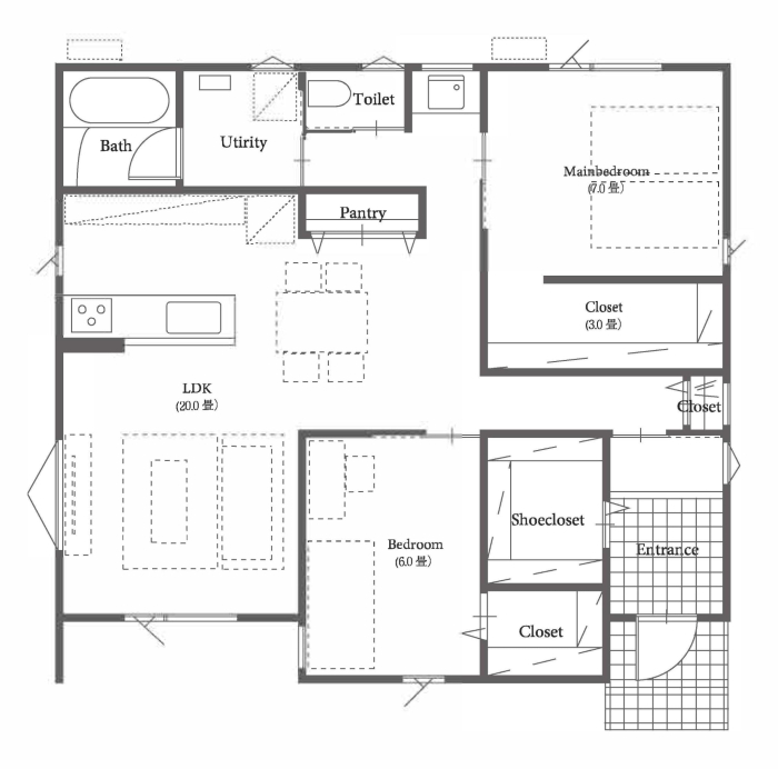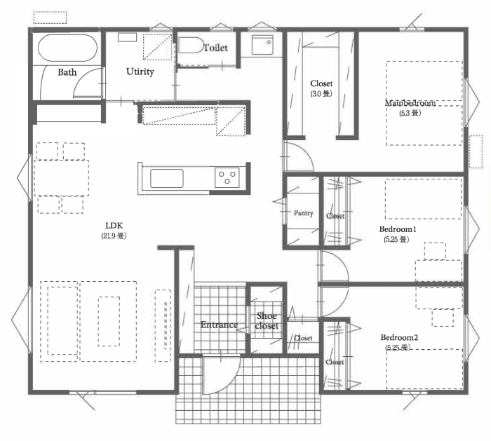 収納充実の2LDK平屋。ウォークインタイプのシューズクローゼットで玄関もスッキリします。寝室には3帖のウォークインクローゼットを設け、こちらも収納力も抜群です。また、パントリーを設け、家事動線にもこだわりました。快適さと収納力を兼ね備えた、暮らしやすい住まいです。