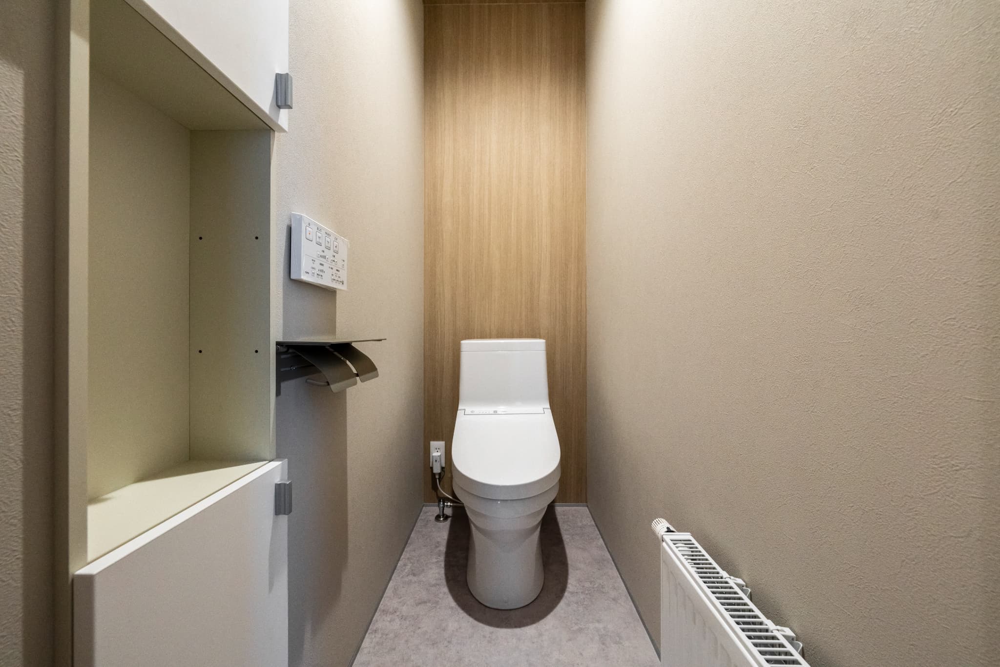 キッチンと同様に、洗面・脱衣室やトイレも合板フローリングです。全体的なデザインに統一性があり、合板フローリングと無垢フローリングで違和感がないように配慮されています。