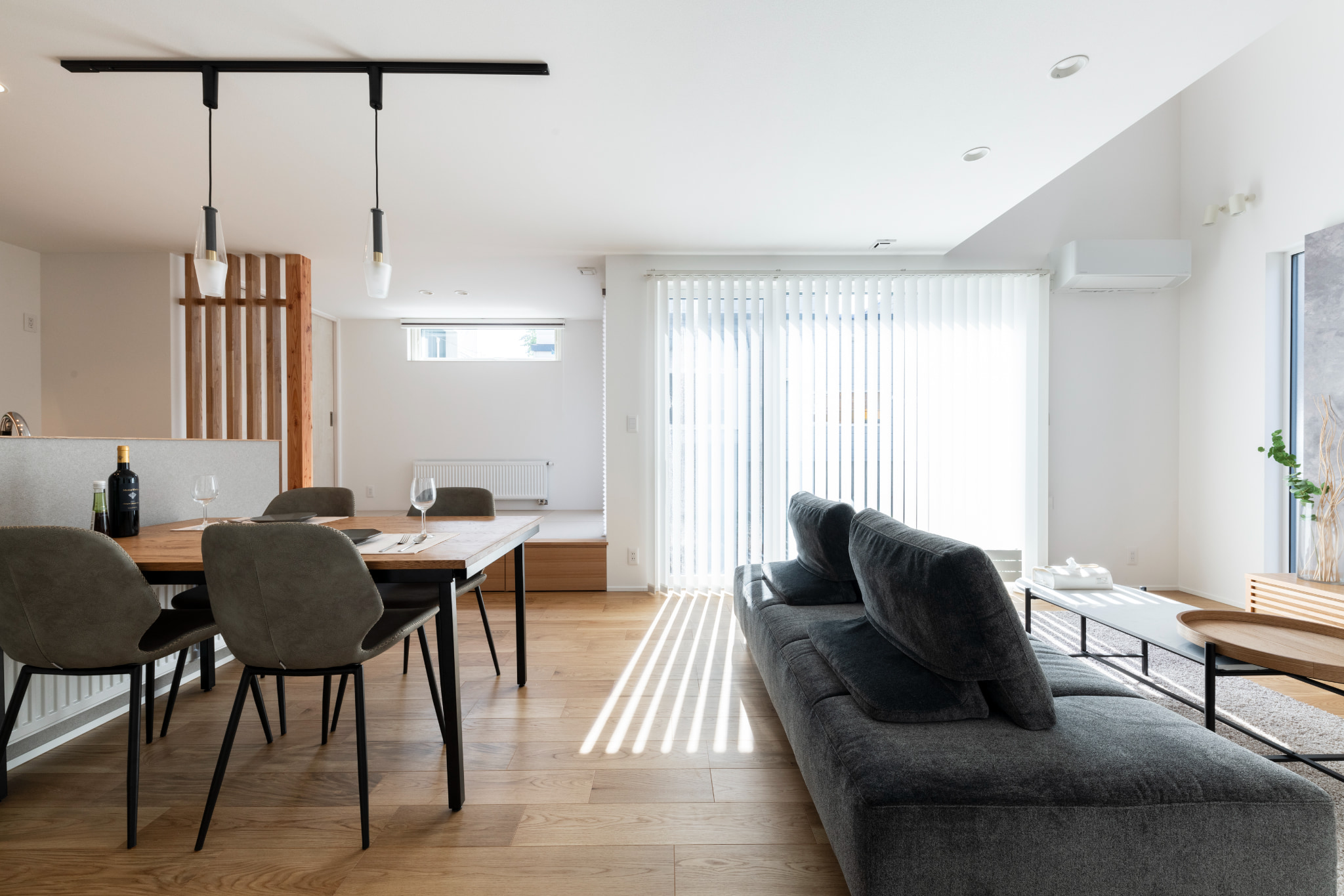 床下エアコンの設置によって、デザインにこだわりながら、快適さも追求。無垢材の床を優しく暖め、部屋全体を均一な温度に保ちます。スタイリッシュな空間と省エネ性を両立させた、機能美が光る住まいです。