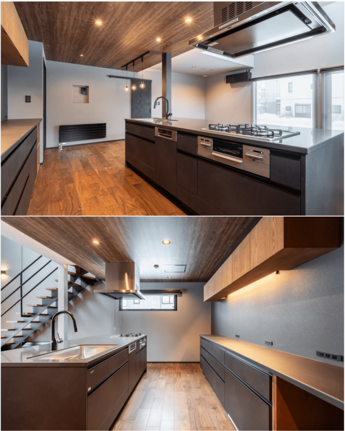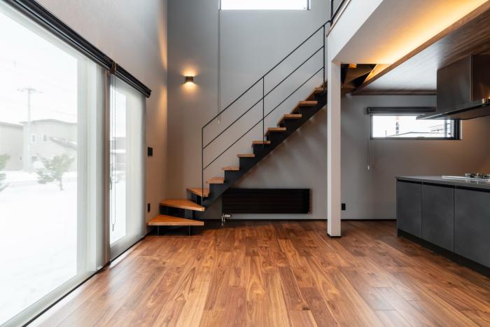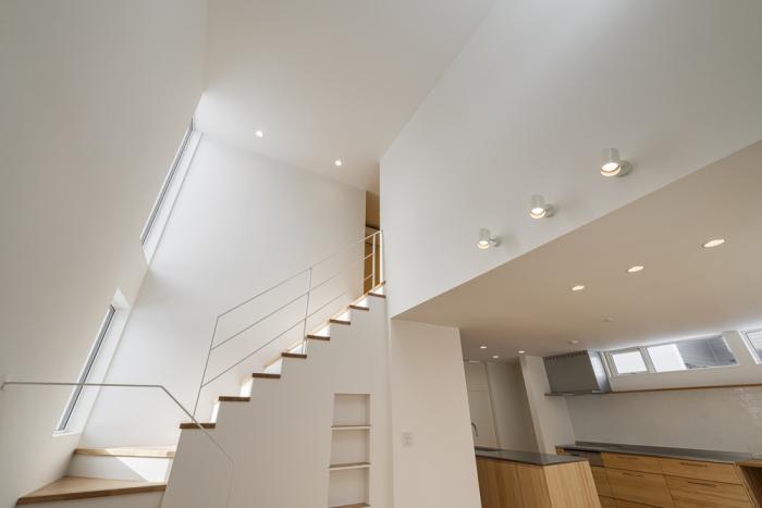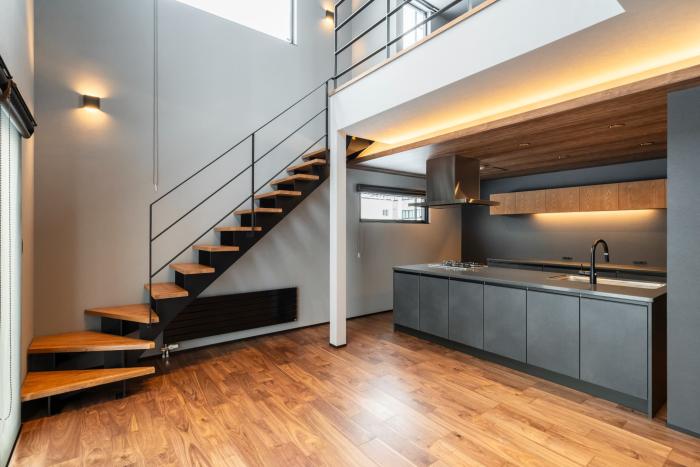 吹き抜けと相性の良い「リビング階段」はキッチンとなじむように色合いを統一されていて、まるでインテリアの一部のような美しさです。