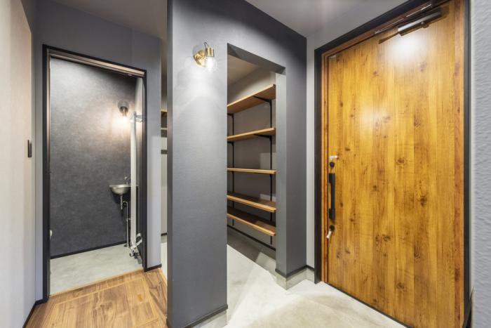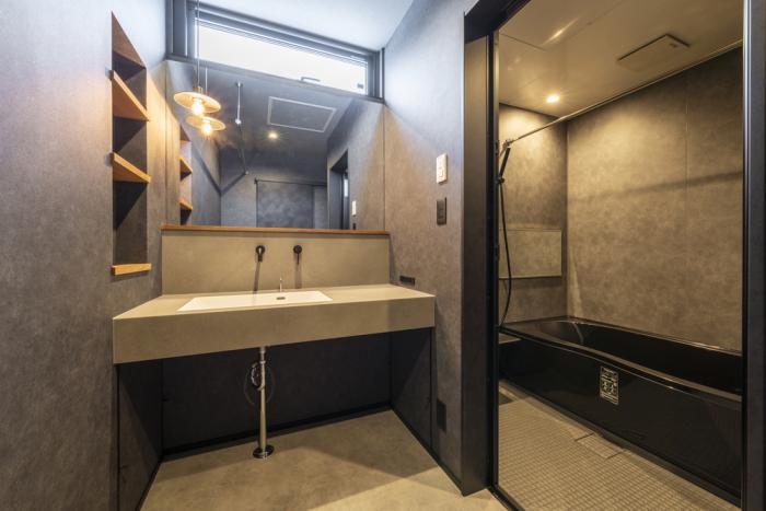 お風呂場と洗面所はシックなダークトーンで合わせており、ホテルのように高級感あふれる仕上がりです。