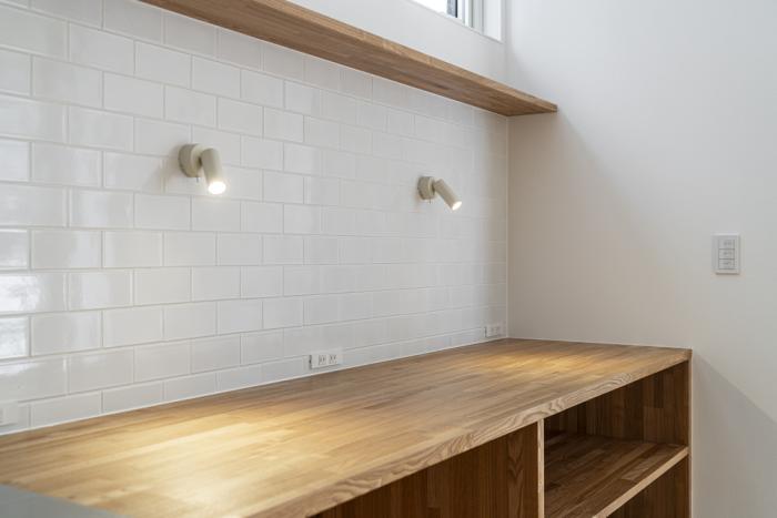 キッチン壁面のタイルとスポットライトが、カフェのようにかわいらしいお家の施工事例です。