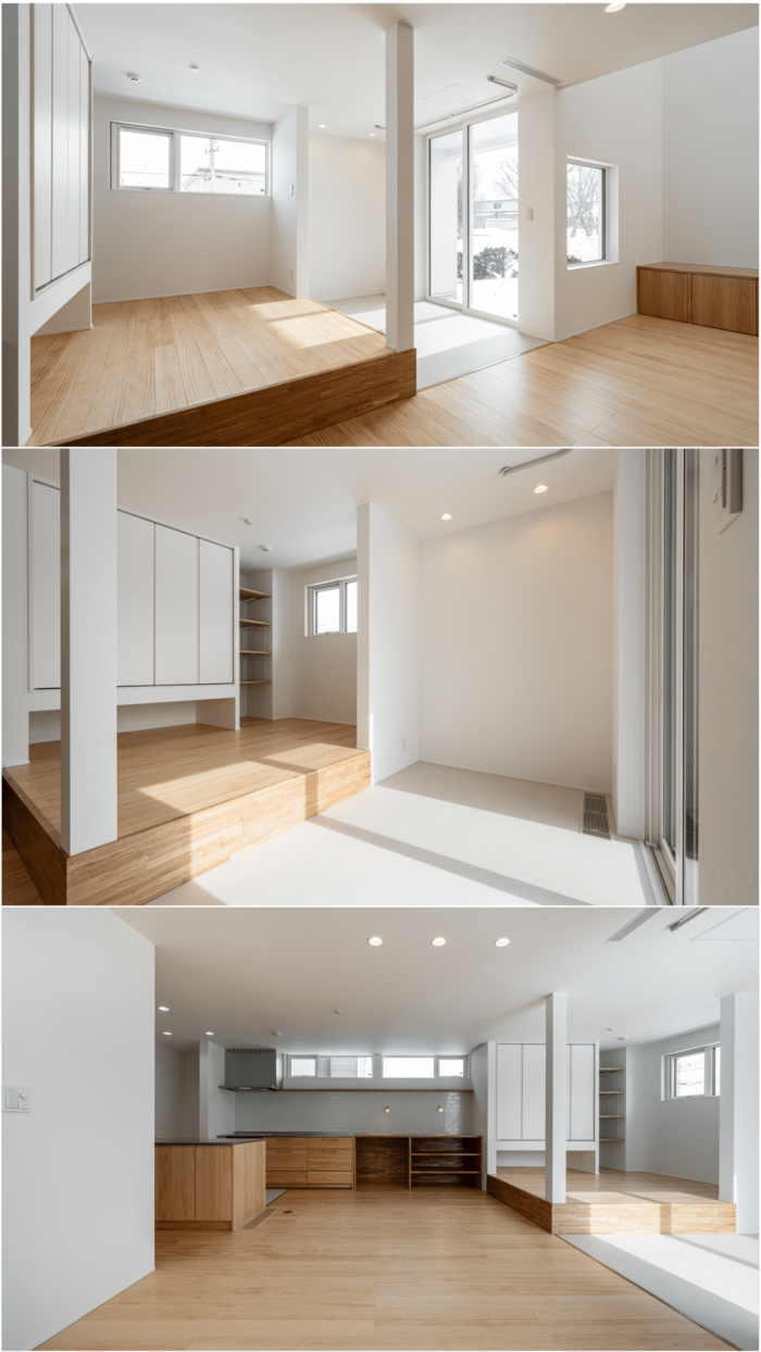 リビングには光がたっぷり入る小上がりが配置されていて、お昼寝やキッズスペースとして利用できます。小上がりとは、部屋の一部分だけ床を高くしたスペースです。