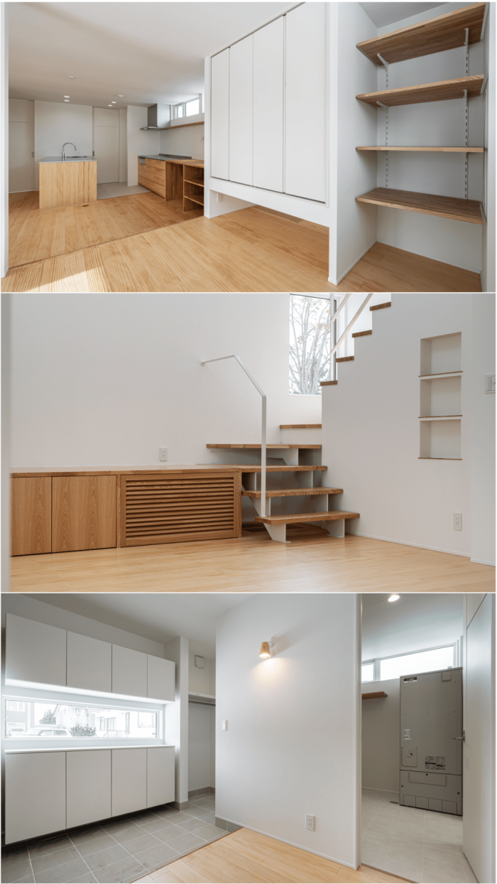 小上がりの壁面や階段横、玄関ホールに収納スペースをつくり、スッキリ片付けられるように空間を上手に活用しています。