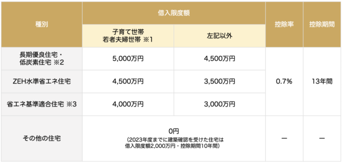 住宅ローン減税の借入限度額や控除期間は、住宅性能などによって区分されます。