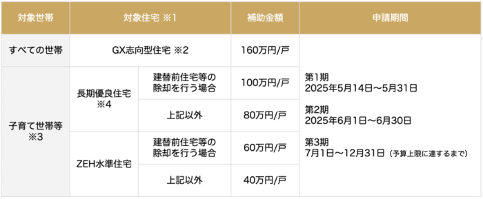 子育てグリーン住宅支援事業の補助金額と対象住宅、申請期間は、次のとおりです。
