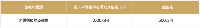下表のように、非課税になる金額は住宅の性能によって異なります。