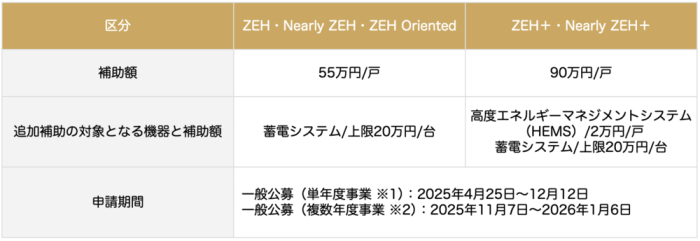 ZEH補助金の補助金額と概要、申請期間は以下のとおりです。
