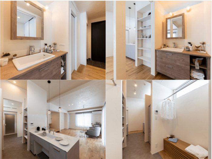 玄関に入ると洗面室とキッチン、リビングとつながっていて移動しやすい間取りです。扉を設けないことで、効率よく空気が循環します。