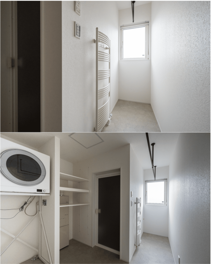 洗濯物を干せるランドリールームのタオル掛けにも、温水ラジエーター「タオルウォーマータイプ」が導入されています。タオル掛けと暖房の2役をこなすので、洗濯効率もアップします。