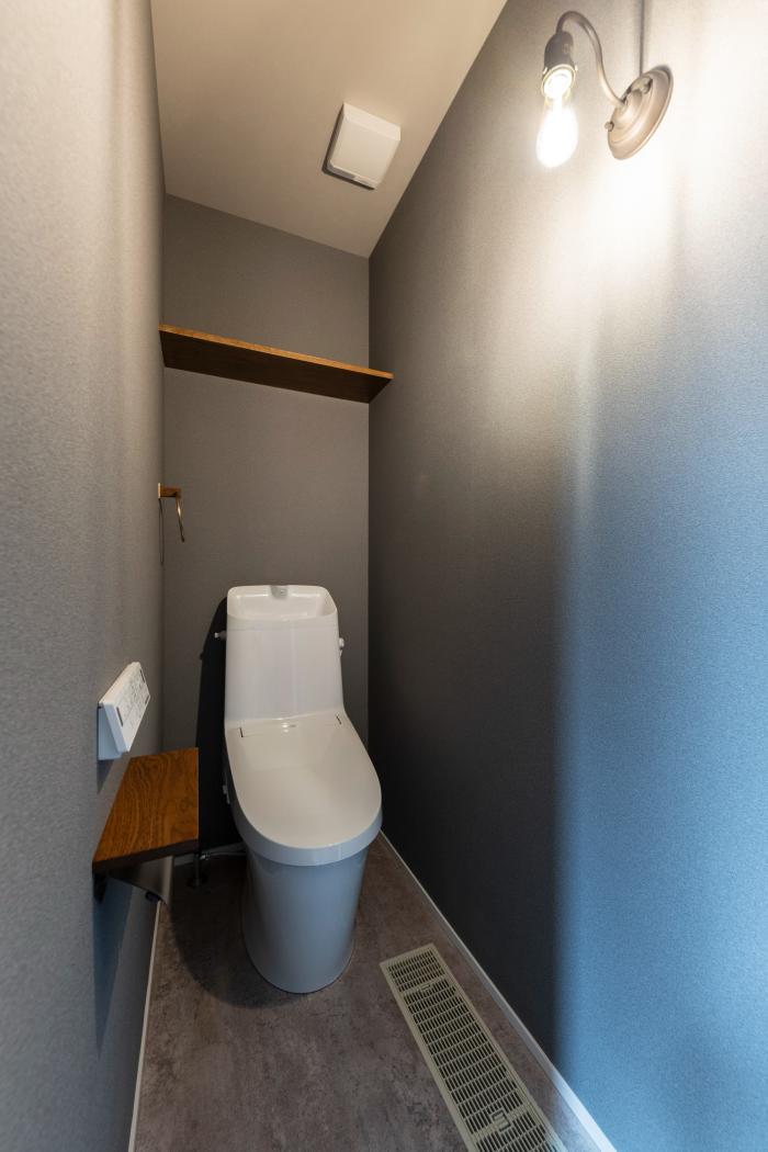 面積の小さなトイレは、大胆なアクセントクロスにも挑戦しやすい場所です。こちらの実例では、グレーのベースクロスに淡いネイビーのアクセントクロスを合わせ、暗いトーンで統一させています。