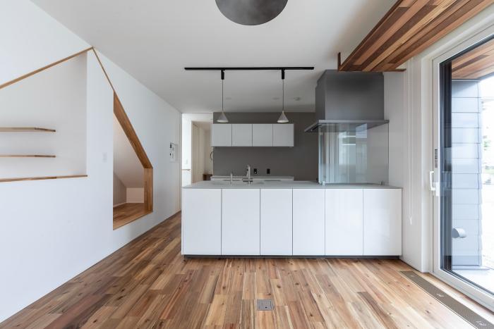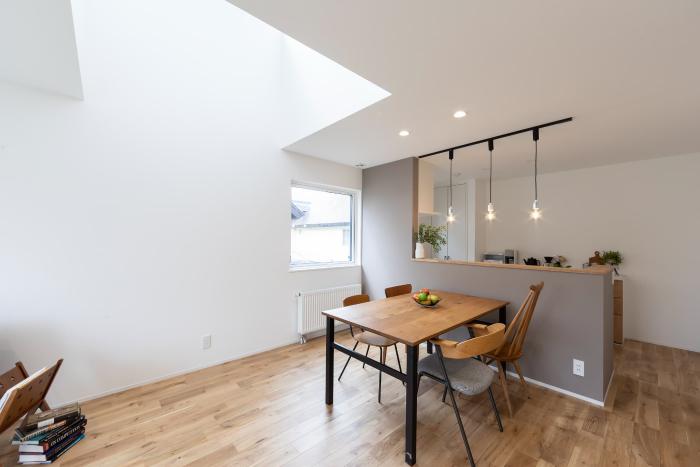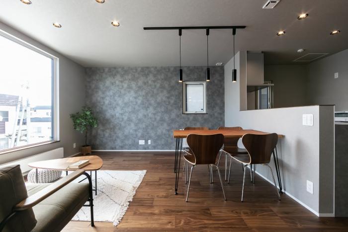 キッチンの背面やヌックの奥にも、グレーのアクセントクロスを採用することで、LDK全体がまとまった印象です。
