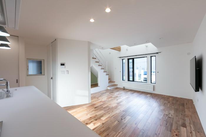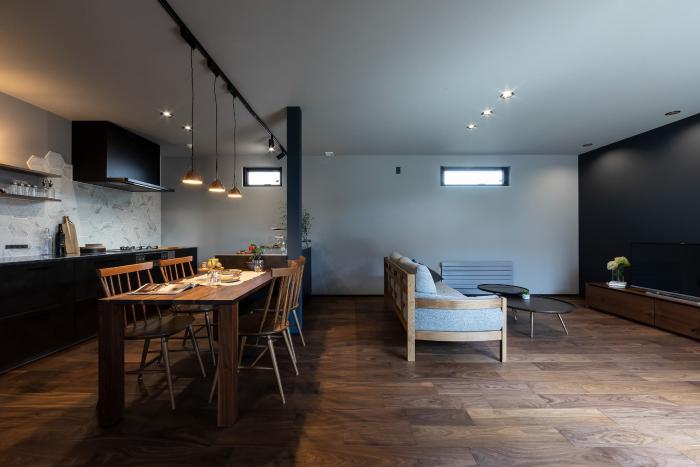 たとえばこの画像の家では、ベースカラーとして壁にオフホワイト、アソートカラーとして床にダークブラウンが選ばれています。
