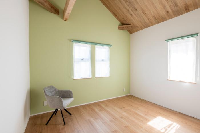 淡いグリーンの壁紙や温かみのある木目が、北欧の雰囲気を連想させます。こちらの事例の寝室では、部屋の一面のみにカラーのアクセントクロスを採用。天井には木目のクロスを取り入れました。