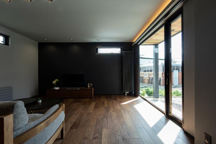 実例2:ダークグレーのアクセントが光るモダンなリビング