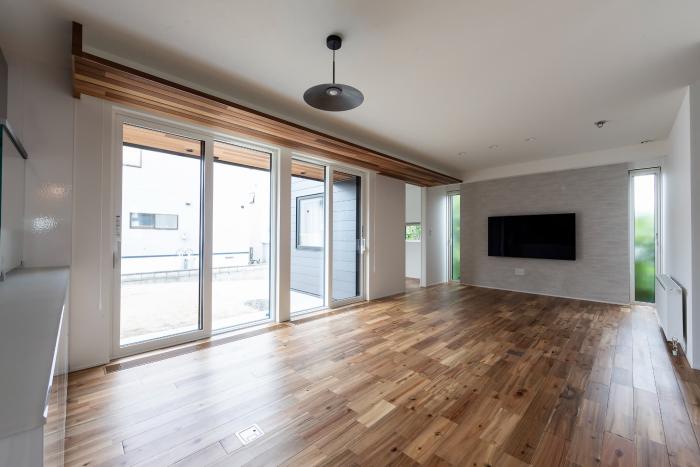リビングのテレビ背面に、アクセントクロスを採用した実例です。