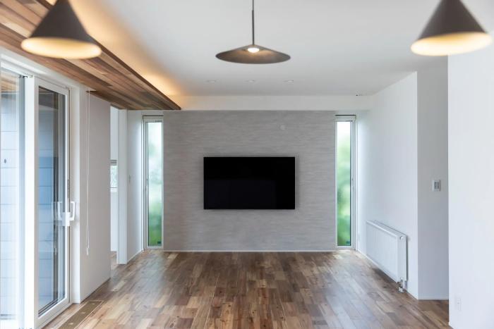 シンプルなモダンテイストにするなら、アクセントクロスに濃いグレーを選び、テレビの背面になる壁に配置する、といった具合で決めていきます。