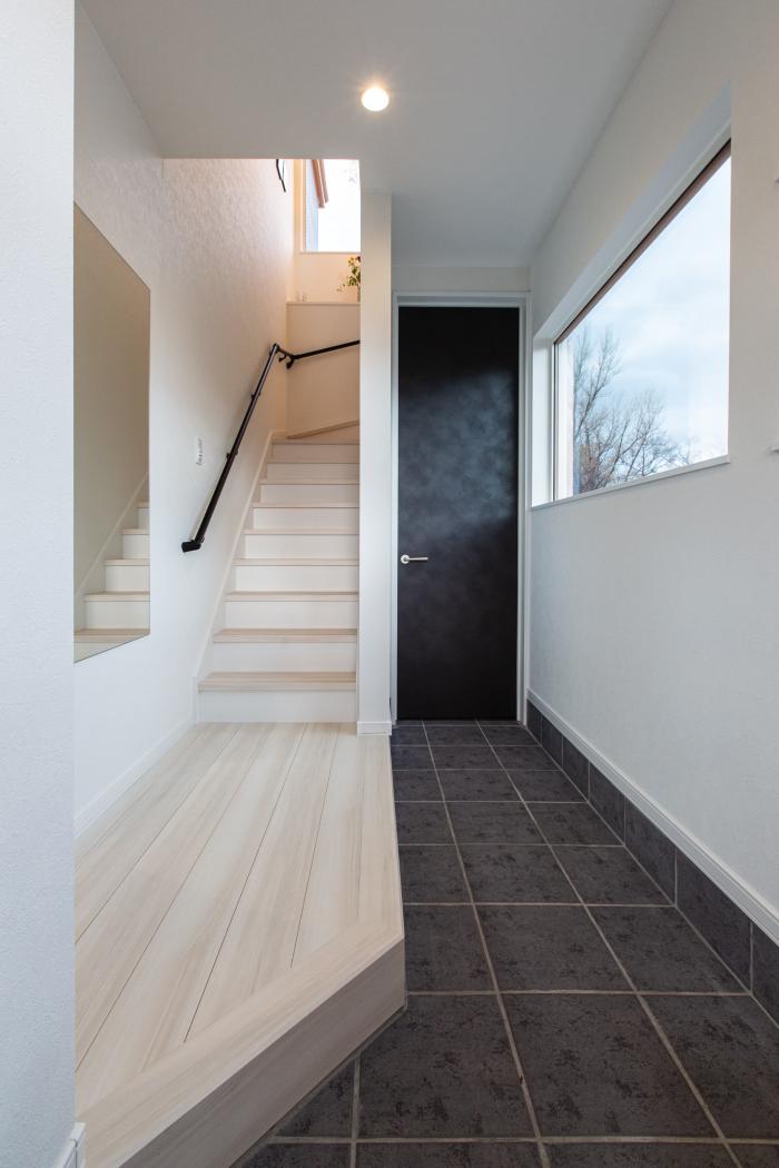 窓からの自然光はない代わりに、上がり框に設置された間接照明が柔らかく足元を照らしてくれます。家に帰ってきたらほっと一息つけるような玄関ホールですね。