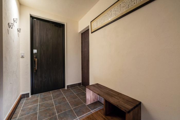 ダークブラウンの扉に木製のベンチ、同一系統の色味に合わせた床のタイルに塗り壁など、和モダンのインテリアに統一された落ち着いた玄関ホールです。壁に掛けられた額縁も、和の雰囲気にぴったり合っています。