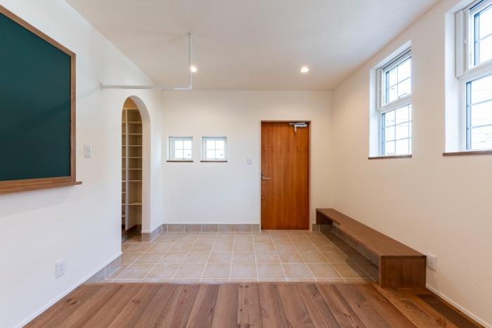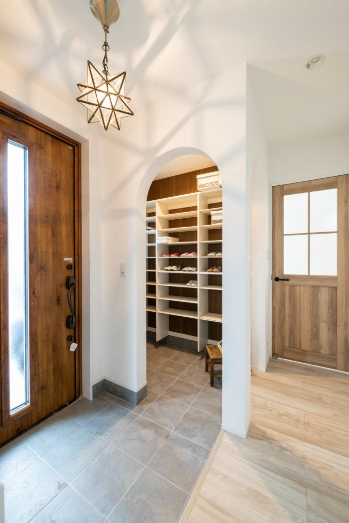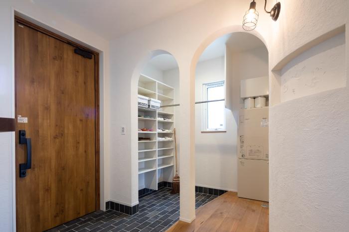 アーチ状の垂れ壁の奥はシューズクローゼットになっており、大容量の収納スペースが確保されています。