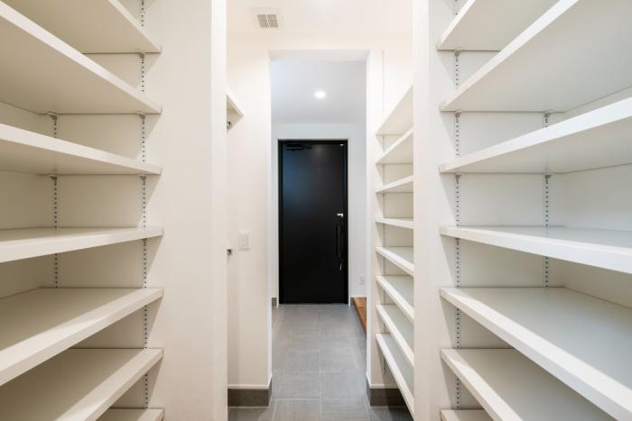シューズクロークは靴を履いたまま出入りできる収納スペースで、従来型の靴箱を設置する必要がなく、スタイリッシュな印象になります。靴以外に傘やコート、ゴルフバッグやベビーカーなどの大きな物まで収納でき、実用性も高く玄関ホールがすっきりと片付きます。