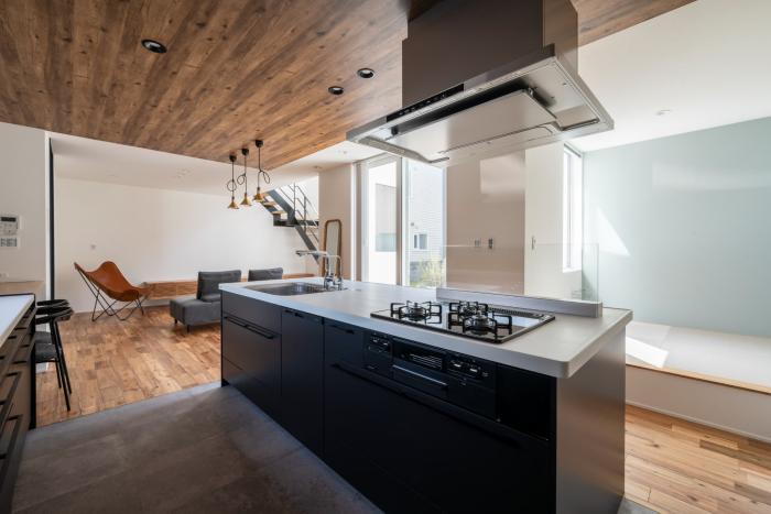 キッチンの正面に配置した小上がり和室の実例です。リビングとは離れた位置にあるので、子どもたちは和室で遊び、大人はソファでくつろぐなど、それぞれの時間を楽しむ使い方も叶います。