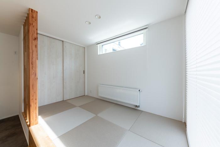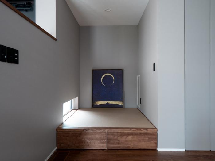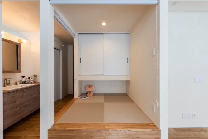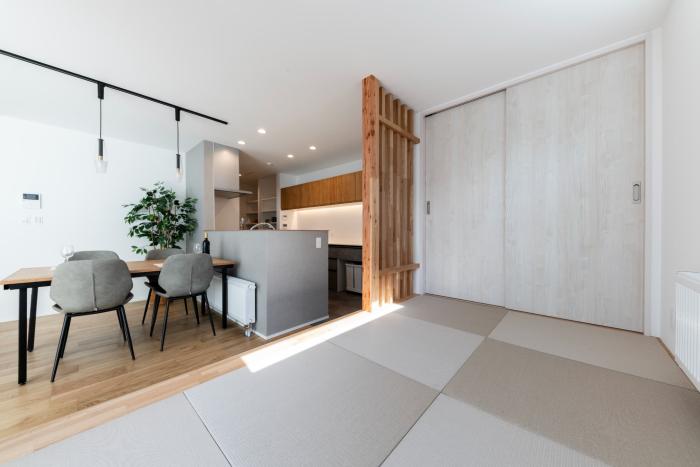 和モダンに似合うグレーの畳が、リビングのインテリアとも調和しています。リビング側はロールスクリーンの間仕切り、通路側は縦格子でゆるやかに区切ることで、使いやすさとデザイン性を兼ね備えた空間に仕上がっています。出し入れしやすい床下収納も、日常的な使いやすさを考慮したポイントです。